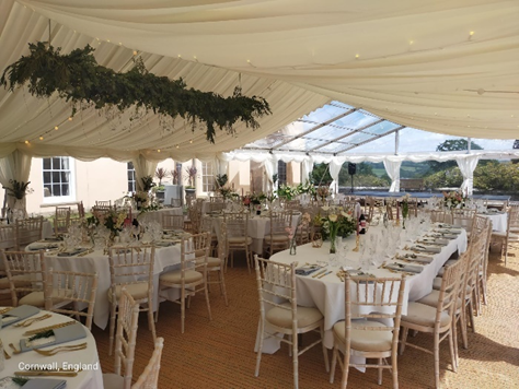 A marquee ready for guests at Pentillie Castle. We love that the clients went for half the marquee as clear roof and half pleated linings over the dining area.