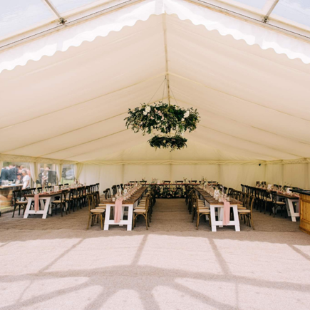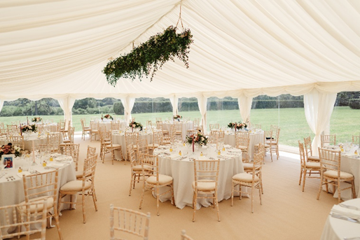 Classic marquee wedding, with hanging foliage planks and stunning table decorations.