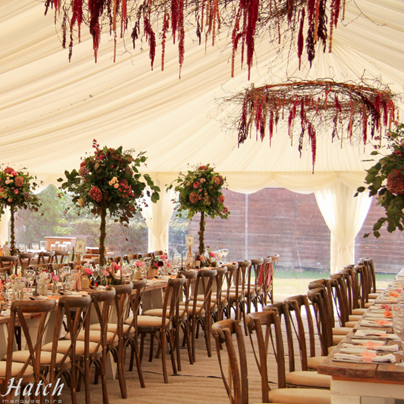 Cross back chairs! They seem to work with any decor…adding a bit of a woody warmth. We love the hanging decorations, which give a really natural feel to this marquee.