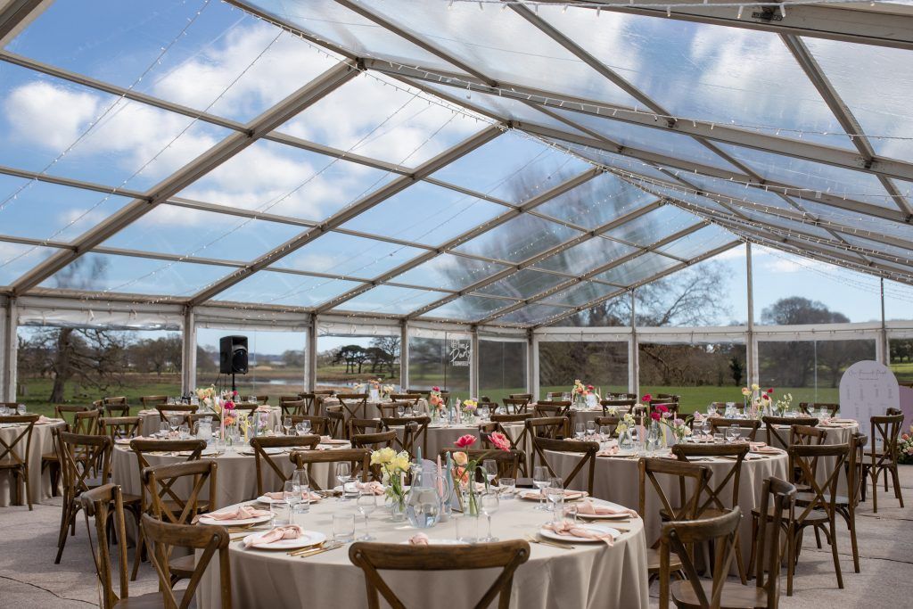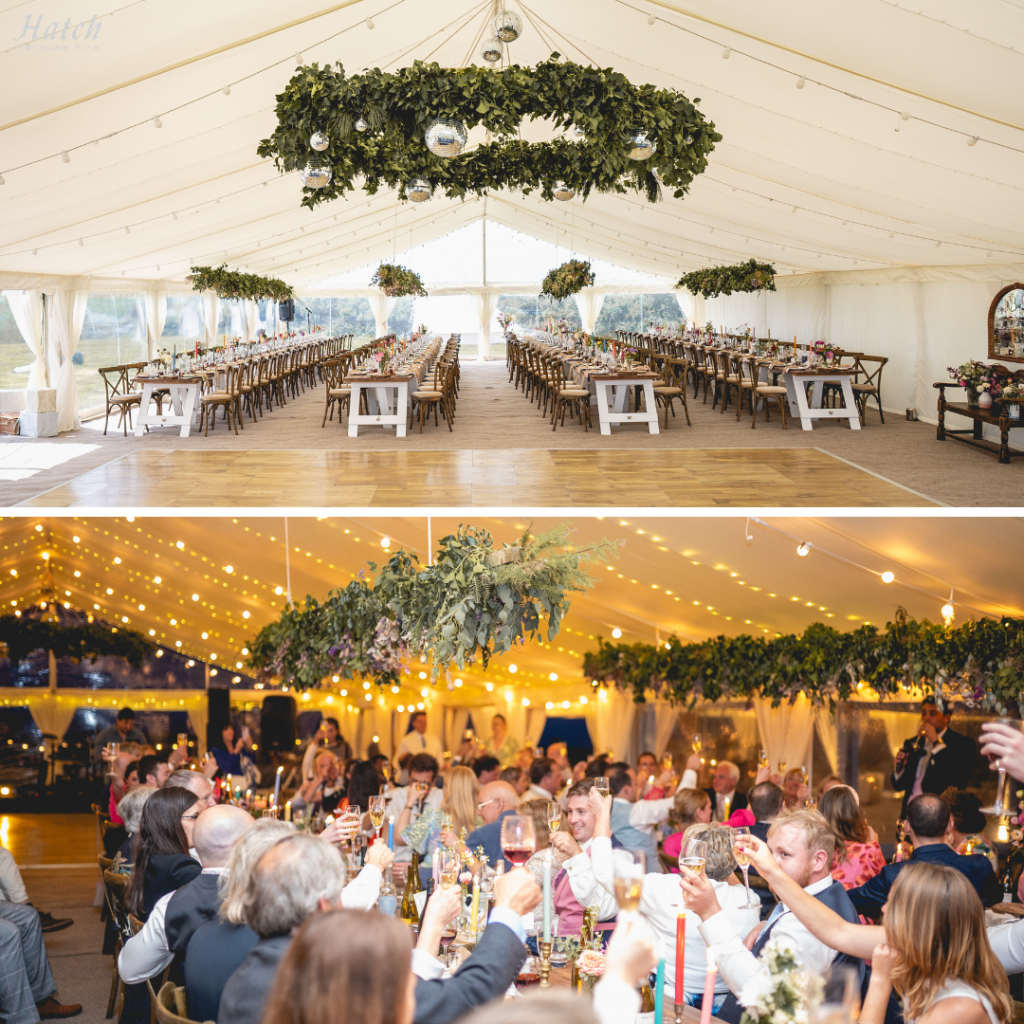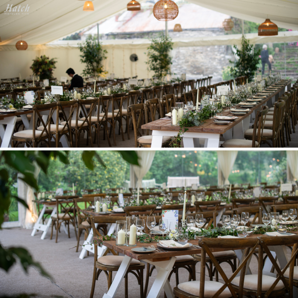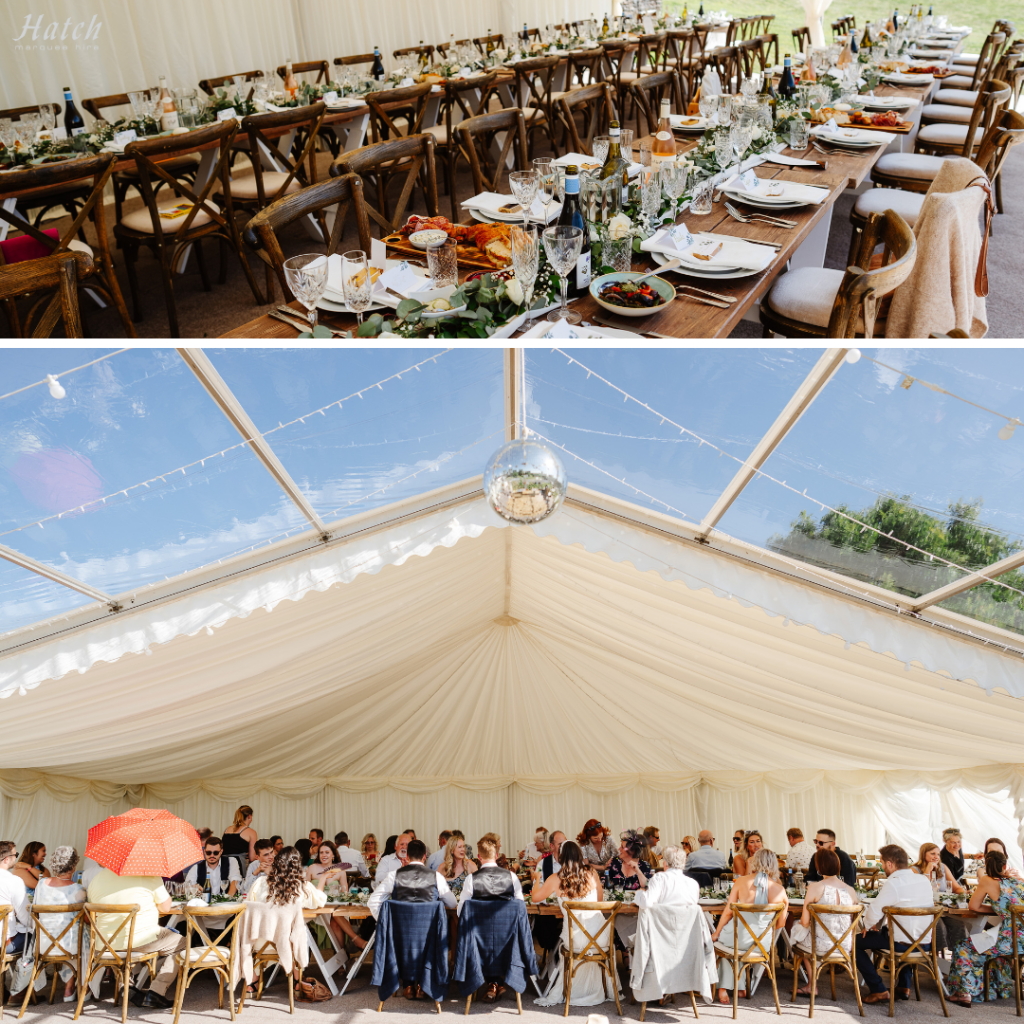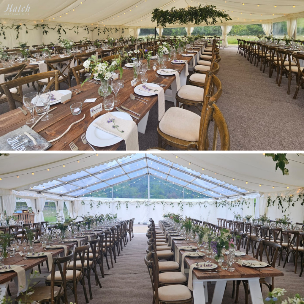 A fully clear 12m x 24m marquee to make the most of those beautiful views. Joe and Rose chose our cross-back chairs paired with our round tables, we think it looks stunning.
