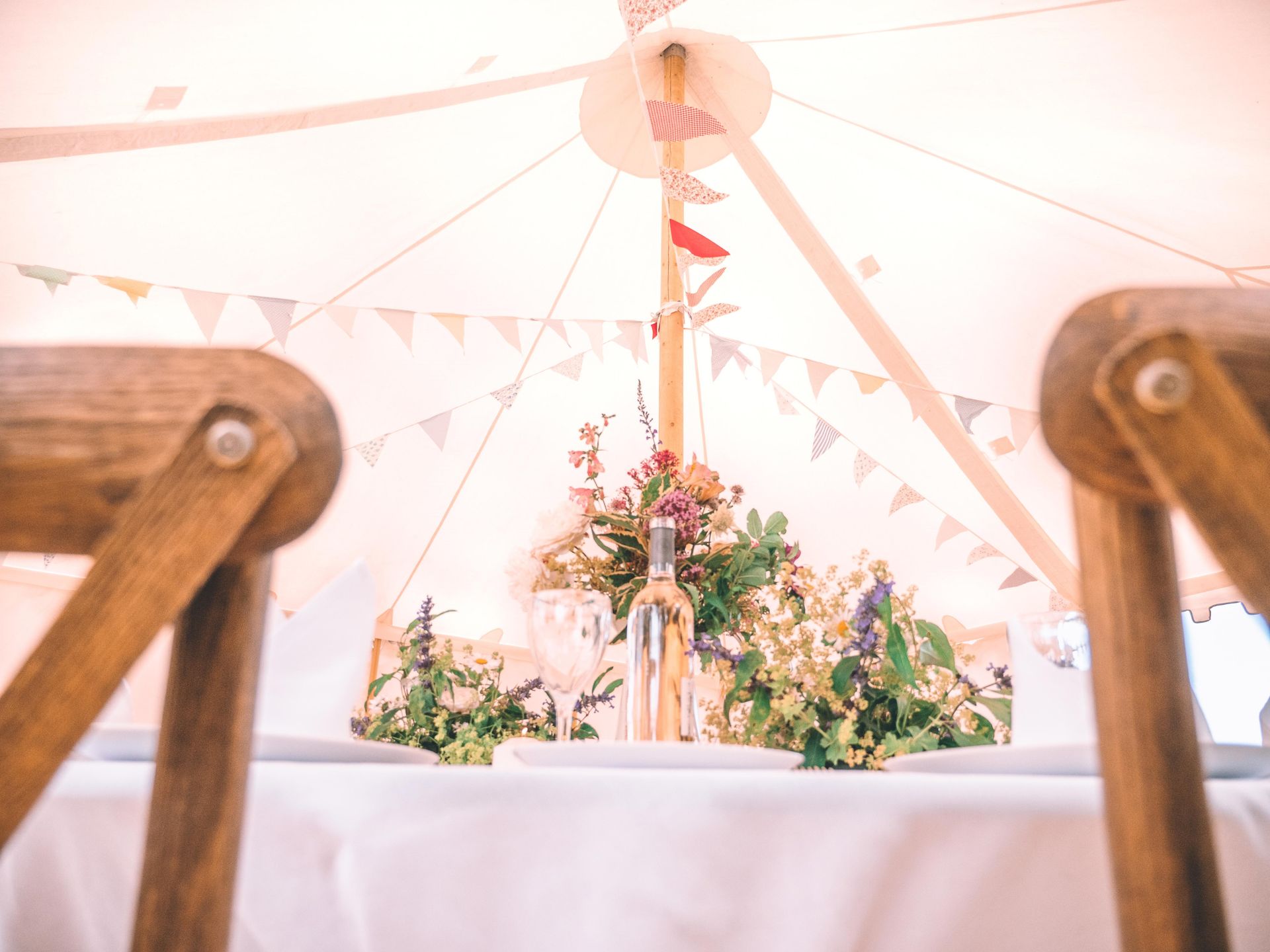 The Sailcloth marquee is beautifully styled to enhance the elegance of a Pole Marquee. Ideal for any special rustic event, elegantly creating a stunning wedding venue.