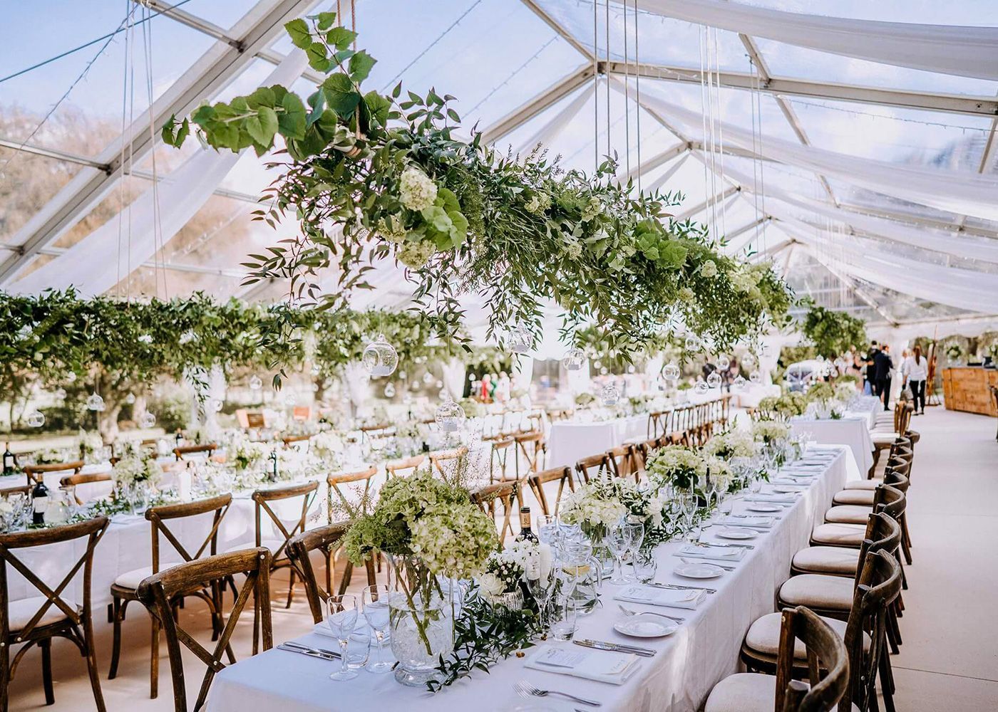 There are plenty of arrangements to choose from. We can also supply clear roof rounded ends to our marquees which can be positioned as an additional space on the side of a marquee (we call this a reception bubble). Alternatively, you can create a more contemporary twist on a lined marquee by adding a clear gable end. It is a great way of allowing more light into your marquee and again taking in your surroundings.