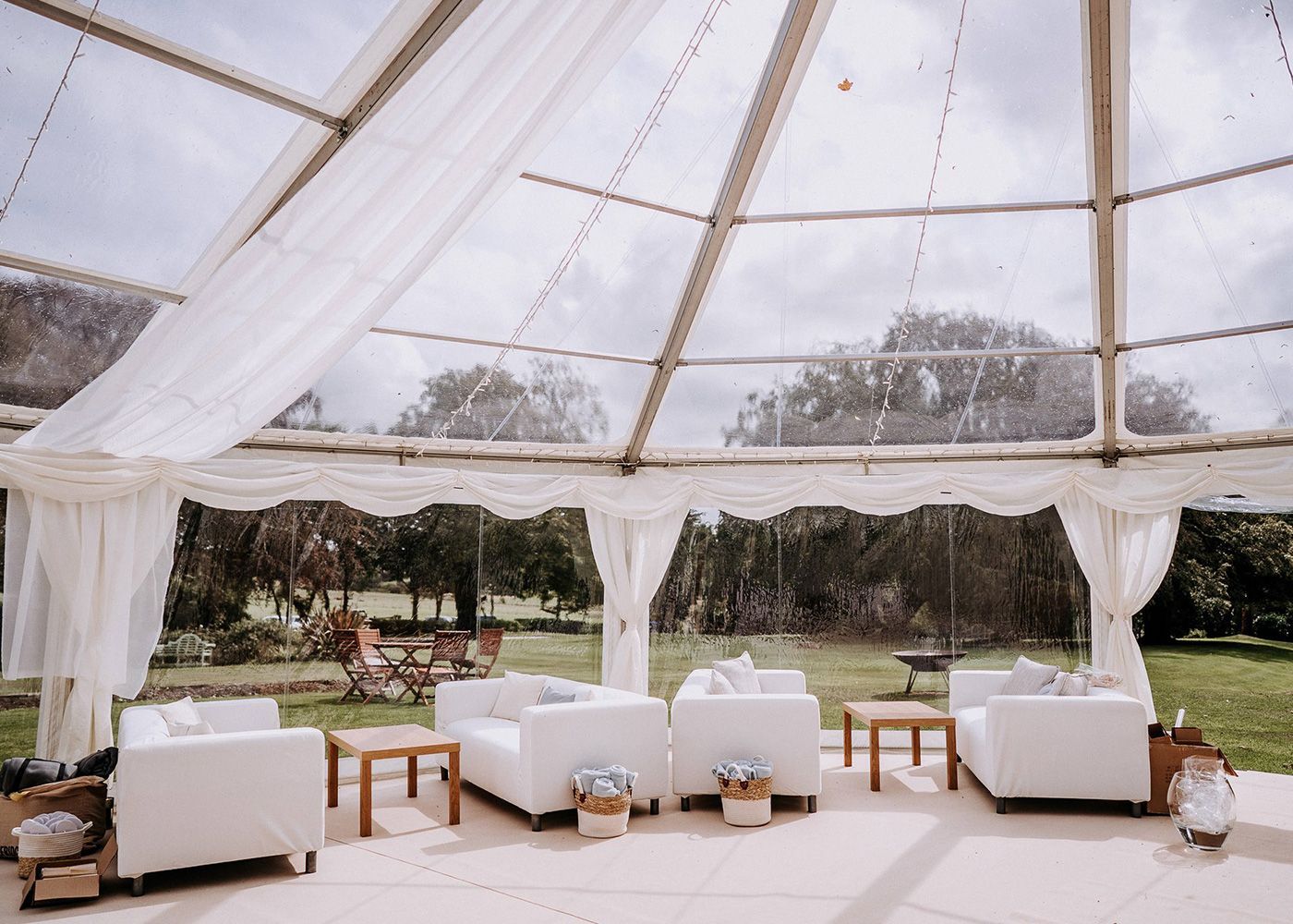 Clear roof marquees are definitely a feature worth considering for your marquee. During a site visit we will look at your space, discuss how we could position your marquee to take in any views of features and importantly, chat through how you would like to use the space for your wedding or party. We’ll then work with you to come up with a layout the works for your site and your ideas!