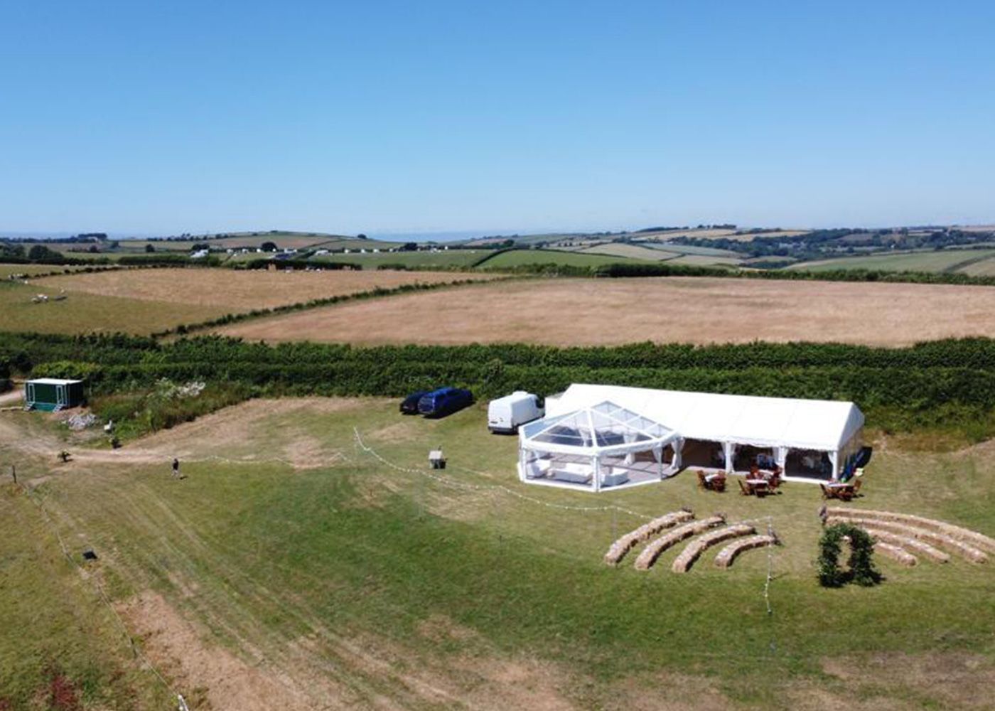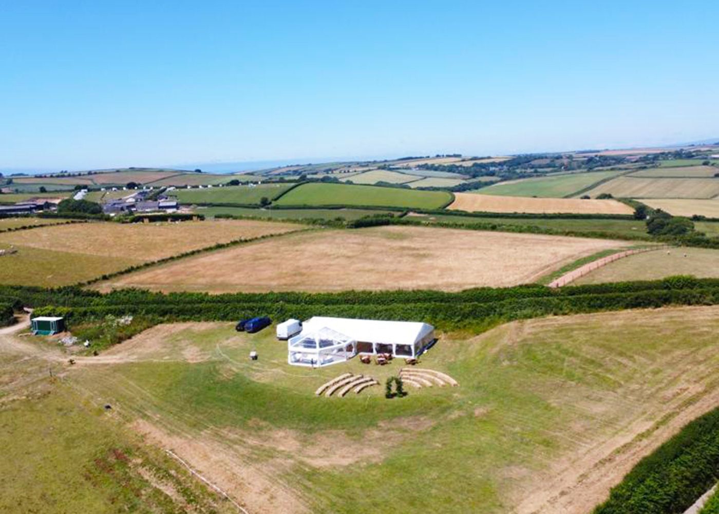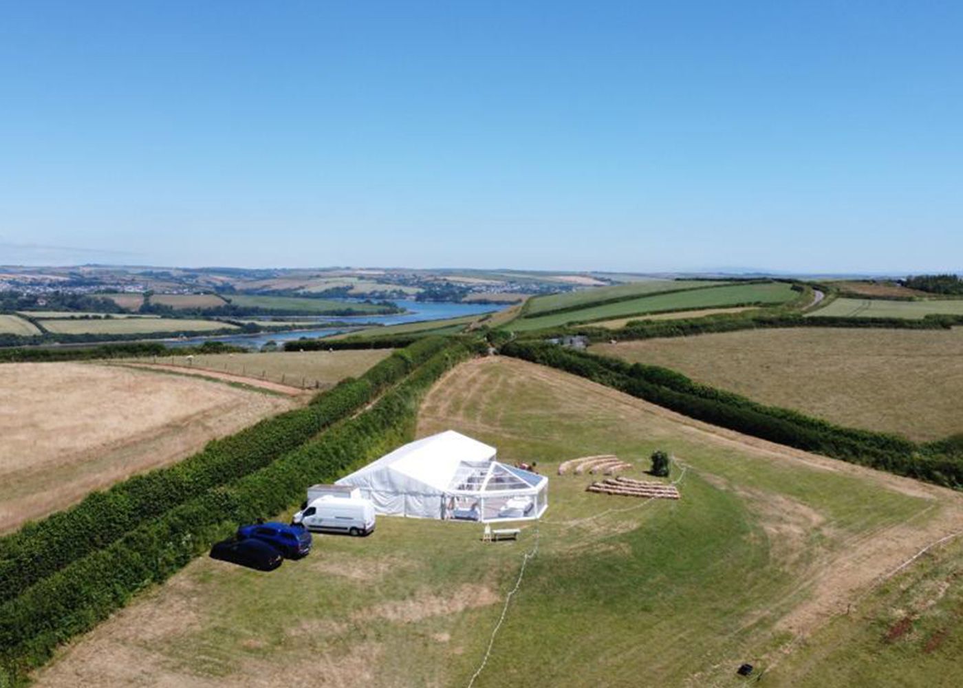 Ample car parking for guests is provided in the field immediately adjacent to the marquee site and is a convenient short walk to the marquee. Salcombe Farm is located in Salcombe and is 20 minutes walk from the town. The views from the marquee site are fantastic and far reaching. The hills around Salcombe Harbour and the churches of East Portlemouth and Chivelstone are within view.