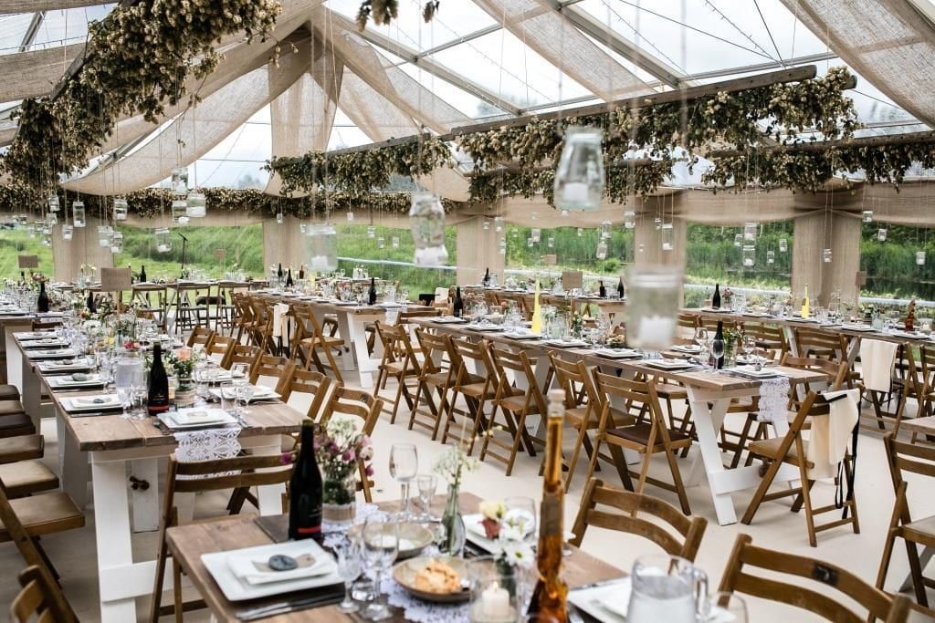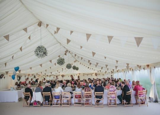 Bunting can be hung from the ridge of the marquee to the top of the side walls. It is up to you as to how many lines of bunting you wish to put up. It can also be hung along the top of the walls throughout the marquee. Based on the size of your marquee you will need to calculate how much bunting you will need. Remember to ensure an allowance to enable the bunting to hang rather than being taut.
