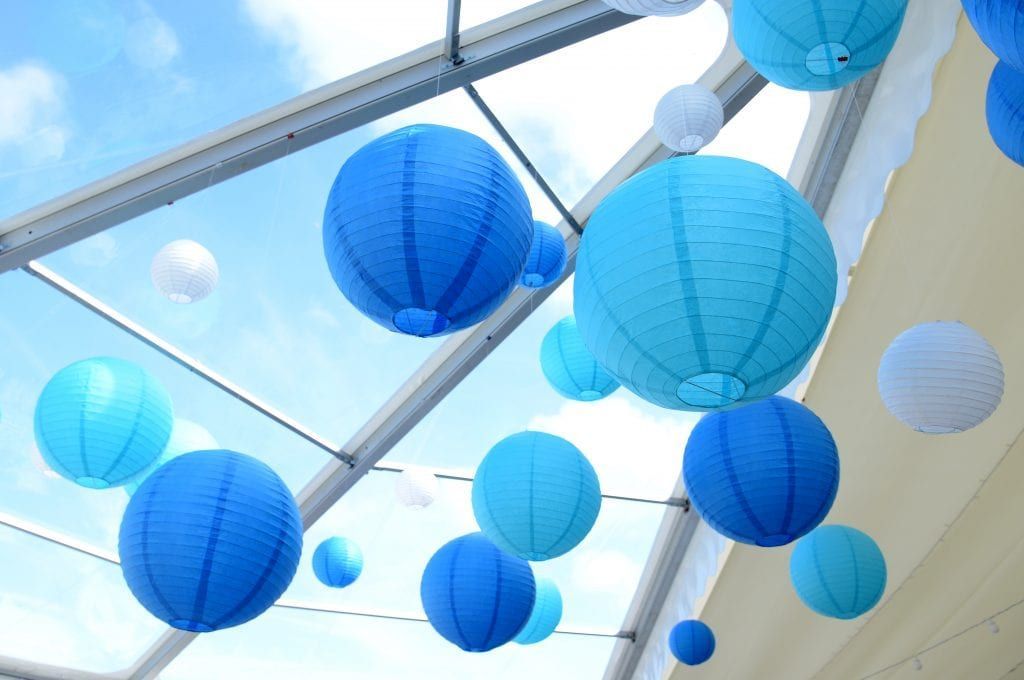 Hanging decorations in the lofty roof space of the marquee is one of the best ways to decorate. It adds colour and atmosphere which combined with fairy or festoon lighting transforms the marquee from day to night. To give you a little help along the way, we have some guidance notes on hanging decorations in our marquees.