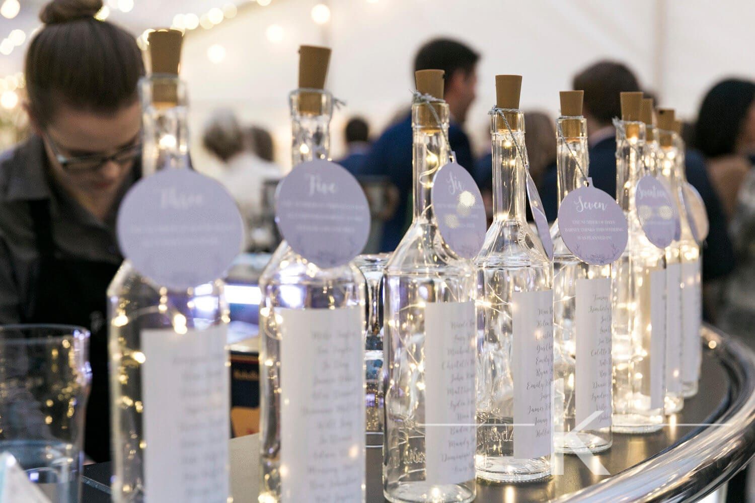 Table Lights: Here’s a lovely idea – glass bottles filled with led fairy lights! In this photo the bottles have been used as table plans which can then decorate each table. So effective especially for a wintry wedding when the evenings are darker much earlier.